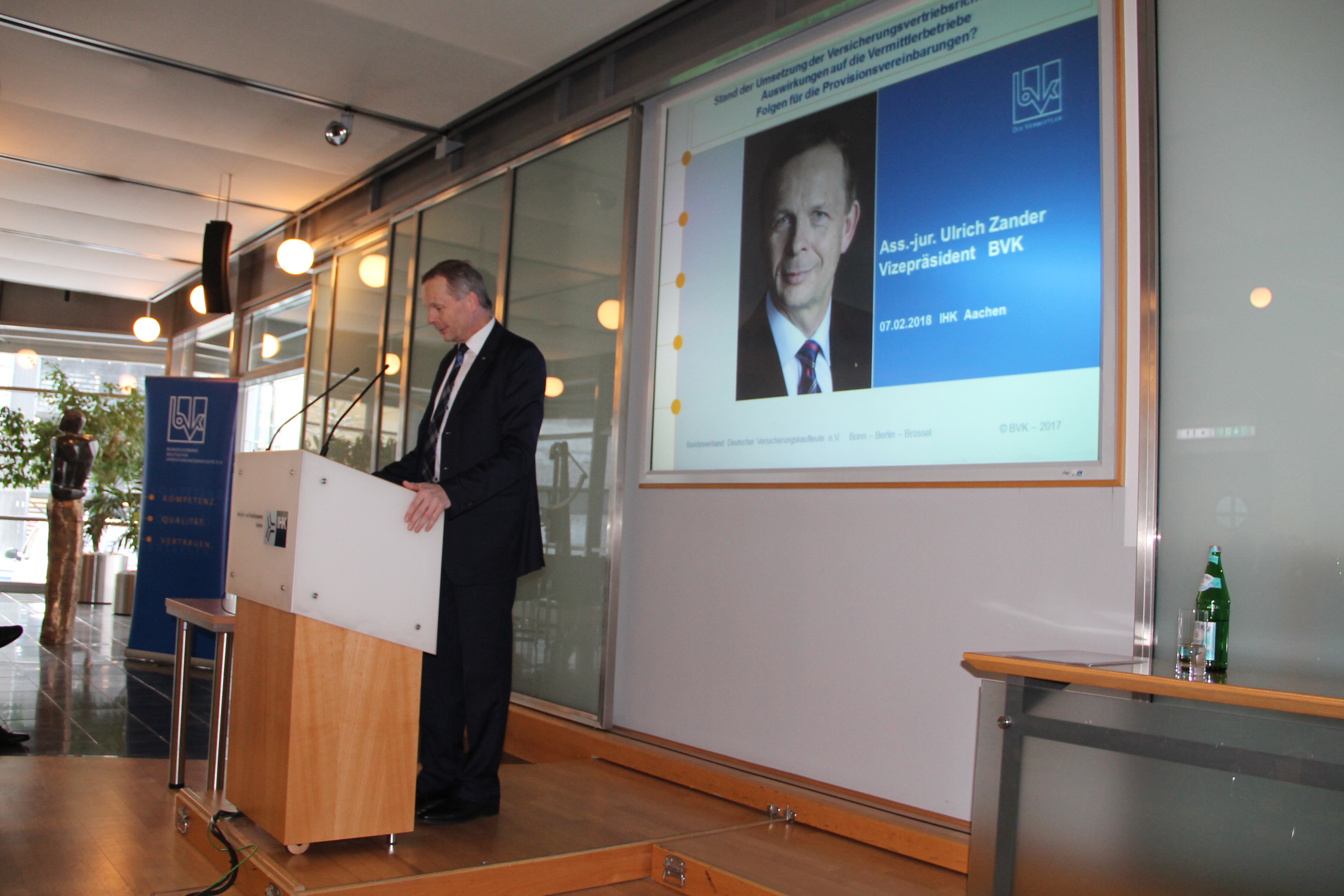 Besonders begrüßt wurde der Referent der im Anschluss stattfindenden Informationsveranstaltung zur IDD: "Die Umsetzung der Versicherungsvertriebsrichtlinie ( IDD ) - Auswirkungen auf den Vertrieb", Herr Ulrich Zander - BVK Vizepräsident und BIPAR Chairman.