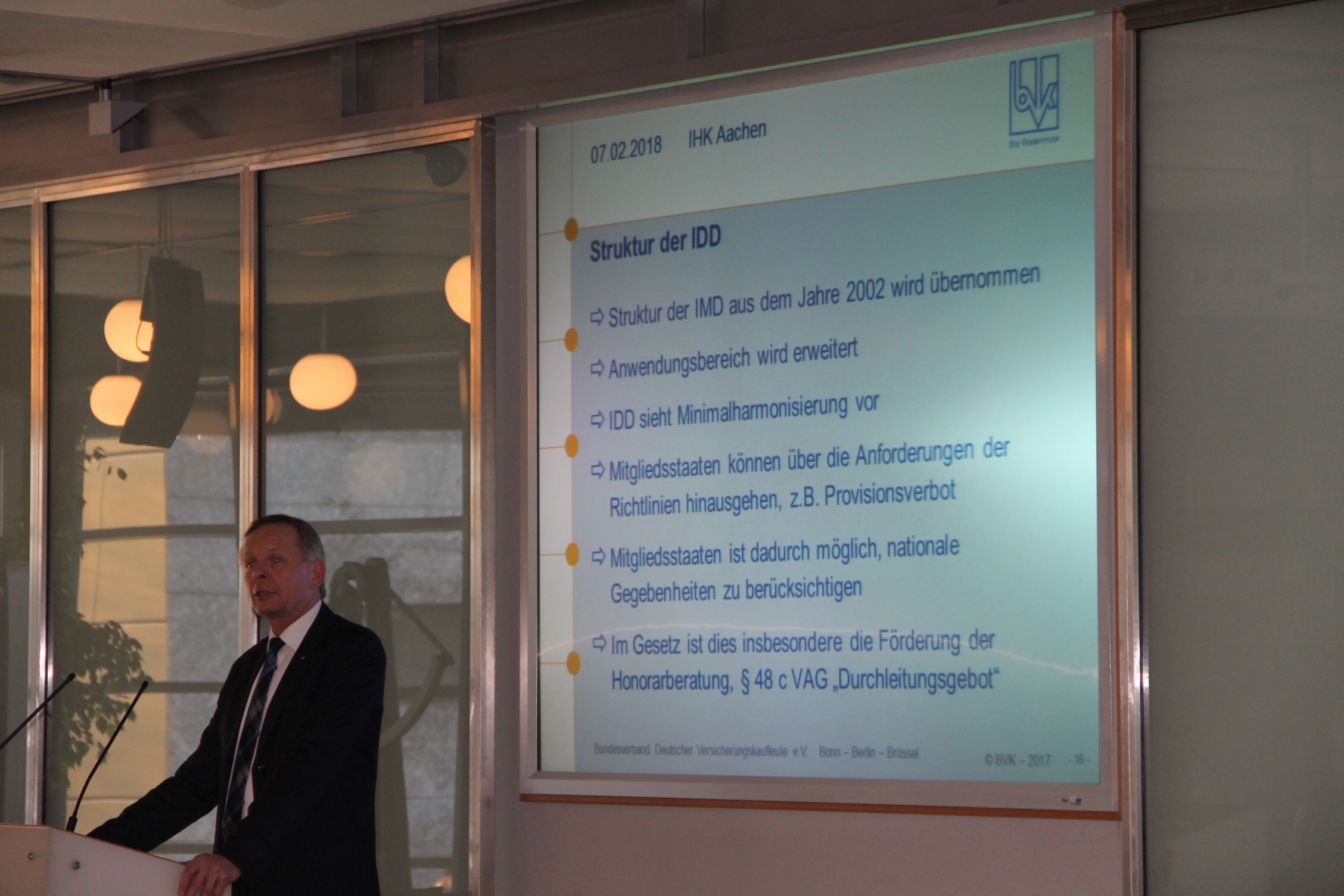 Um 14:50 Uhr schloss Christof Schmitz die Versammlung und die Mitglieder wechselten gemeinsam in das Foyer der IHK-Aachen, wo Herr Zander vor ca. 150 interessierten Kolleginnen und Kollegen zur Umsetzung der IDD vortrug.